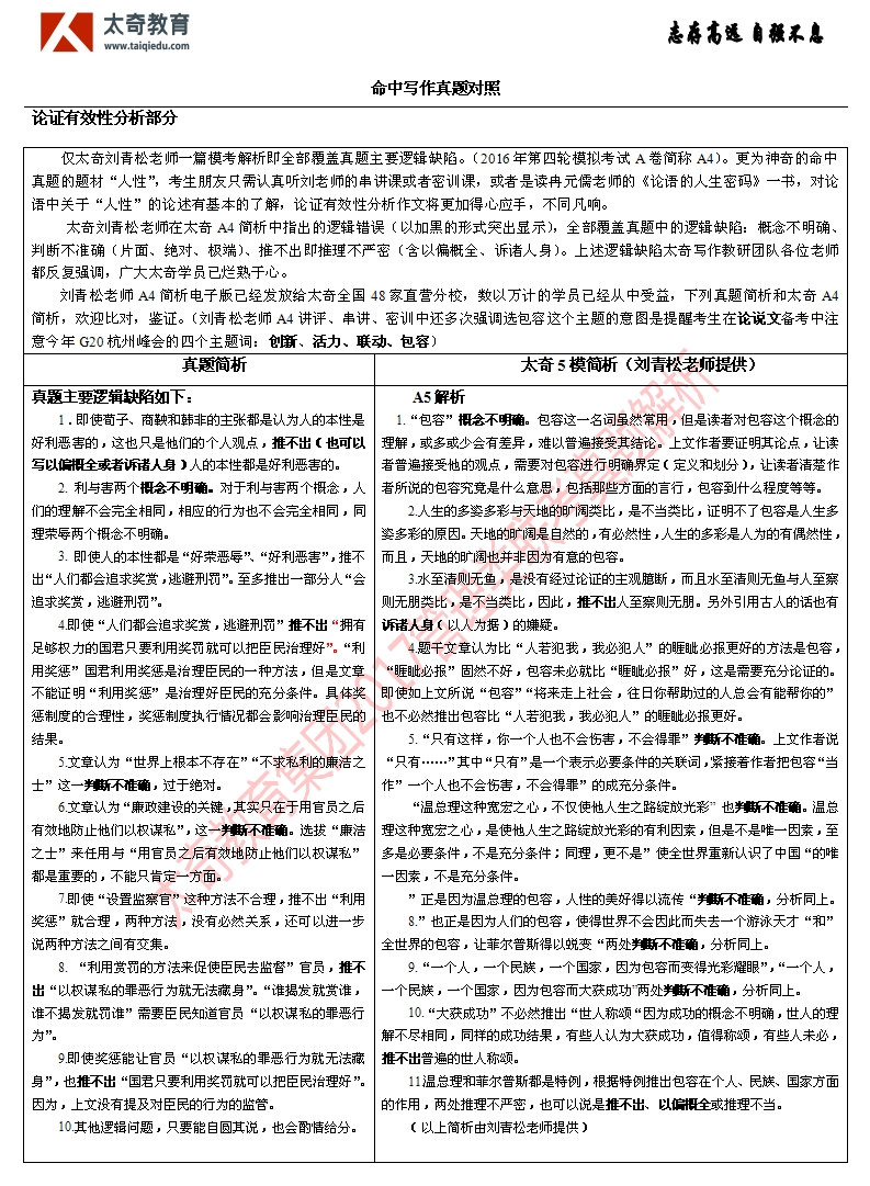 在2017年MBA管理類聯(lián)考中,綜合寫(xiě)作考試部分全部命中,比命中考題更為重要的是:太奇在對(duì)每次模考的知識(shí)點(diǎn)、考點(diǎn),尤其在對(duì)命題方向的把握上極其精準(zhǔn)。